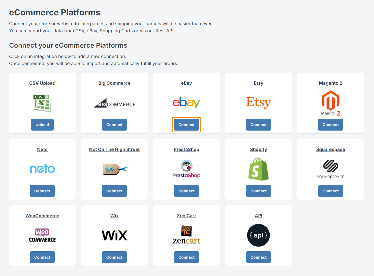 - Log in to your Interparcel account. Hover over the Shipping Tools tab, select eCom Platforms and click Connect Your Cart. Click Connect next to the eBay icon.