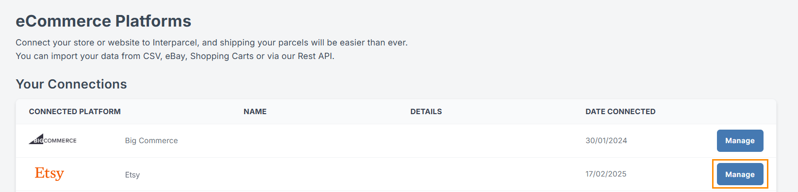 - Hover over the Shipping Tools tab, select eCom Platforms and click Etsy. Click the Manage button, next to the Etsy icon.