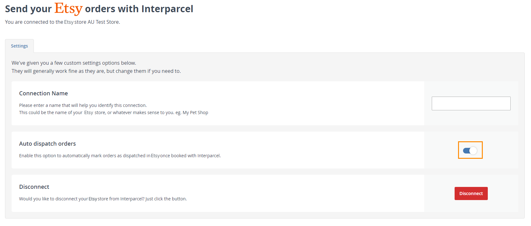 - You can enable or disable the Auto dispatch orders in Etsy. If you enable it, every time you send an order using our Shipping Manager, it will be automatically marked as fulfilled in your Etsy store.