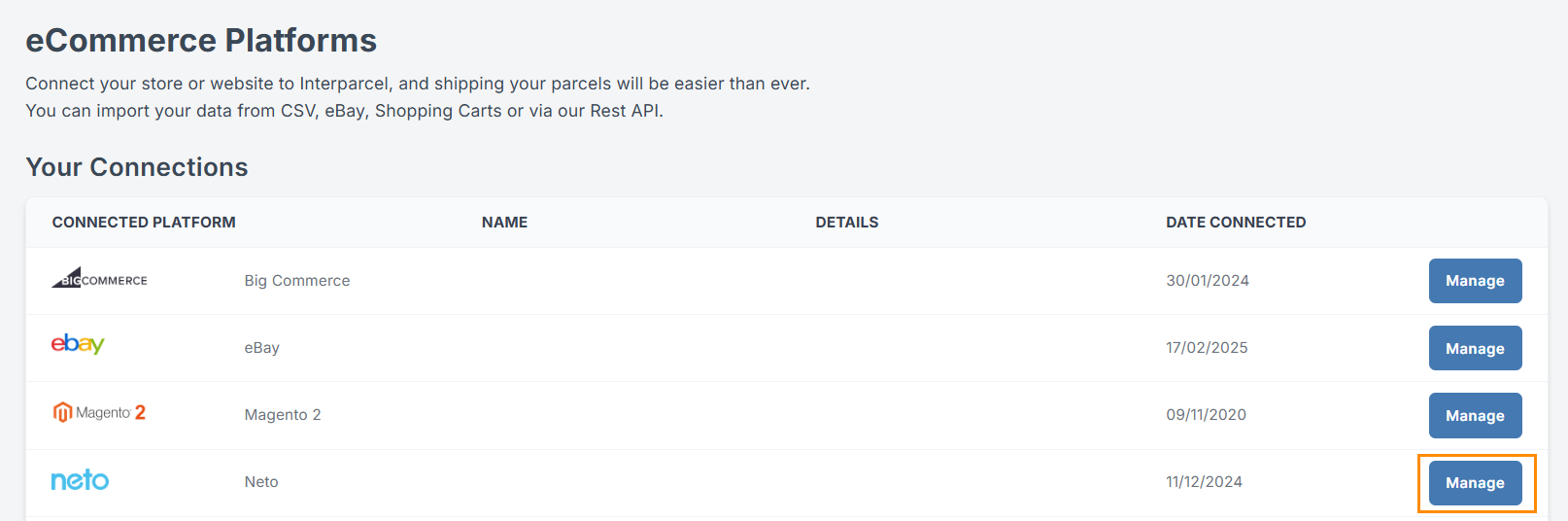 - Hover over the Shipping Tools tab, select eCom Platforms and click Neto. Click the Manage button, next to the Neto icon.