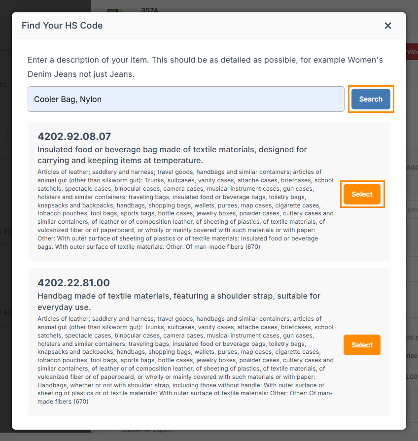 - Enter the item name and what it’s made of, then click Search. The system will display several HS Code options. Select the one that best matches your product.