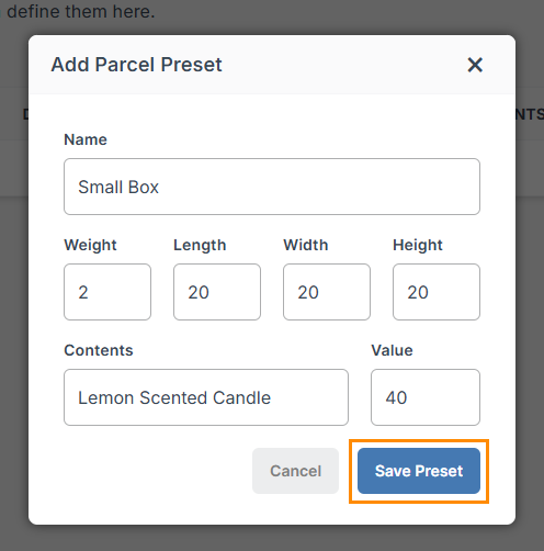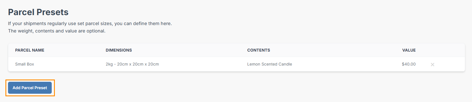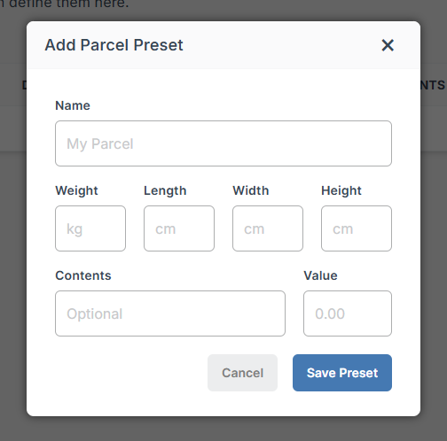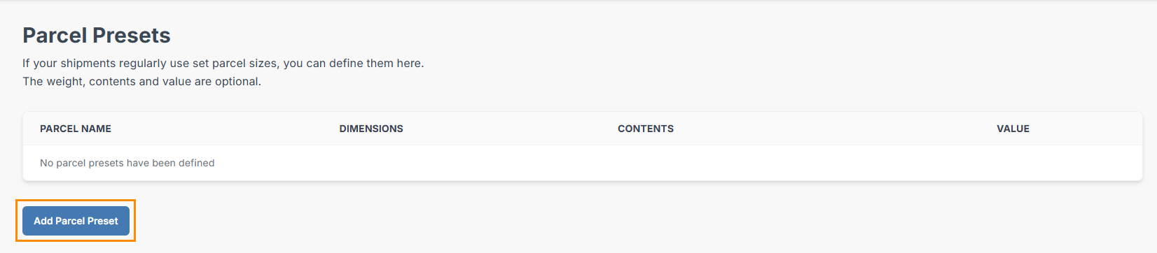 Parcel Presets are particularly helpful if your ecommerce platform doesn’t display live shipping rates at checkout or if you’re not using our inventory section.