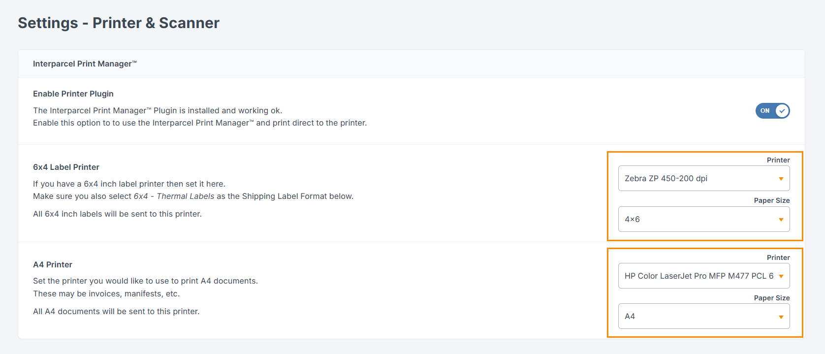 The Interparcel Print Manager is an optional plugin you can install to simplify your label printing. It automates the process, sending labels directly from our platform to your chosen printer, whether it’s a 6x4 label printer or an A4 printer. Say goodbye to the hassle of downloading PDFs and manually selecting your printer for every label.