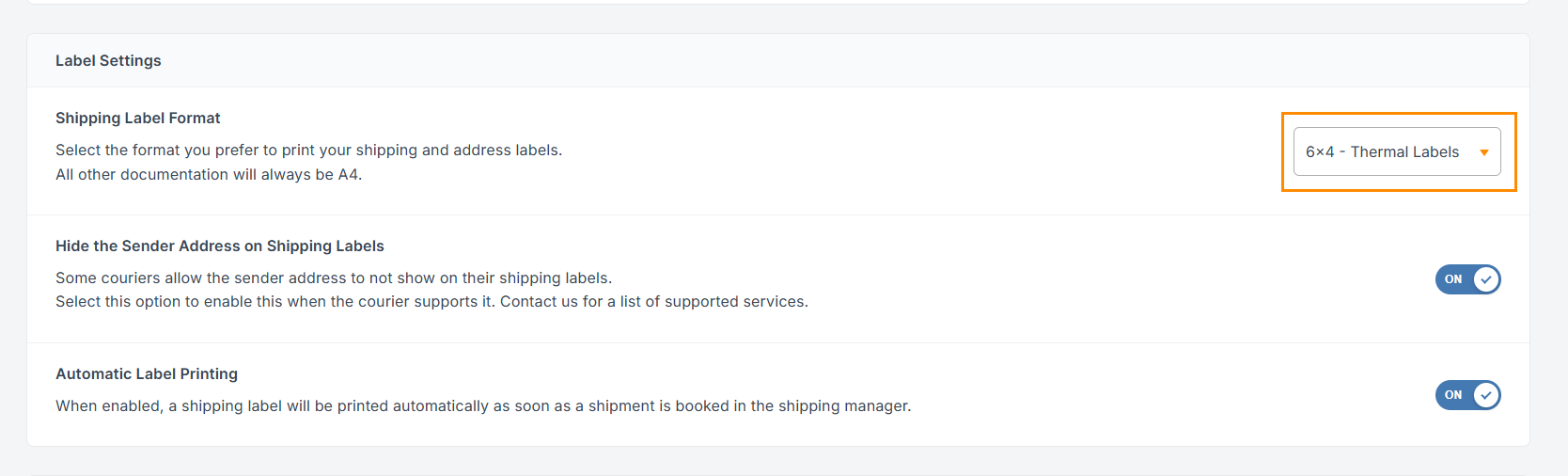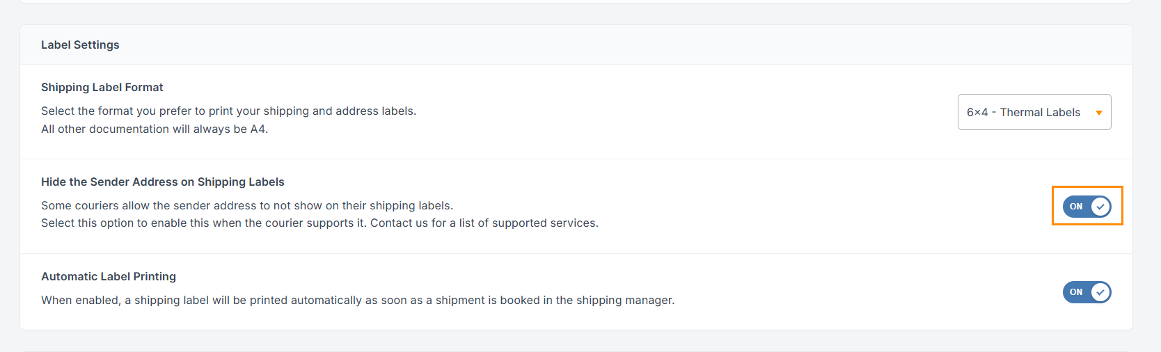 - Enable the Hide the Sender Address on Shipping Labels option if you would like to hide your address when the courier supports it. You can contact us for a list of supported services.