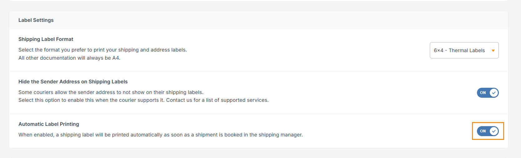 - Enable the Automatic Label Printing option Eto print the labels automatically when you click Book to process an order.